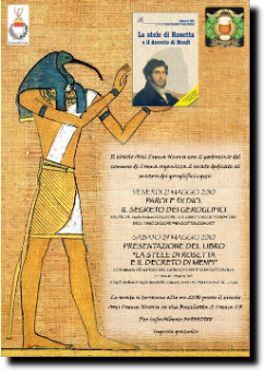 La seconda serata che si è tenuta SABATO 29 MAGGIO è dedicata alla presentazione del libro che si intitola: “LA STELE DI ROSETTA E IL DECRETO DI MENFI”.L’importanza della Stele di Rosetta, conservata al British Museum di Londra e visitata ogni anno da milioni di turisti, è nota al grande pubblico. Recentemente si è anche riacceso il dibattito circa una sua eventuale restituzione all’Egitto. Tuttavia ben pochi saprebbero riferire il contenuto del documento o l’esatta portata storica della sua decifrazione nel XIX secolo da parte dello studioso francese Jean- François Champollion. In quale modo questo celebre pezzo di granito grigio fu utile a quest.’ultimo per diradare le fitte nubi che avvolgevano la scrittura geroglifica? Che cosa avevano inciso gli antichi egizi sulla sua superficie? Qual era il contesto storico dell’Egitto quando la Stele fu incisa? I relatori vi accompagneranno in un suggestivo viaggio che partirà dal celebre reperto per svelarne la storia, il suo contenuto e che proseguirà a ritroso nel tempo tra i vicoli dell’opulenta Alessandria d’Egitto, per terminare accanto agli uomini dell’Armata d’Oriente e a quel gruppo coraggioso di scienziati che fornirono i primi mattoni. per la costruzione di un nuovo edificio: l’Egittologia. L’appuntamento non nasce come conferenza accademica riservata agli addetti ai lavori, ma come un’occasione per appassionati e semplici curiosi di approfondire la conoscenza di un reperto quasi mitico.La conferenza è stata tenuta da Alberto Elli, autore del libro” La stele di Rosetta e il decreto di Menfi” ed esperto di egittologia e lingue semitiche e da Paolo Belloni e Paolo Bondielli, collaboratori dell’autore e soci fondatori del sito http://www.egittologia.net.