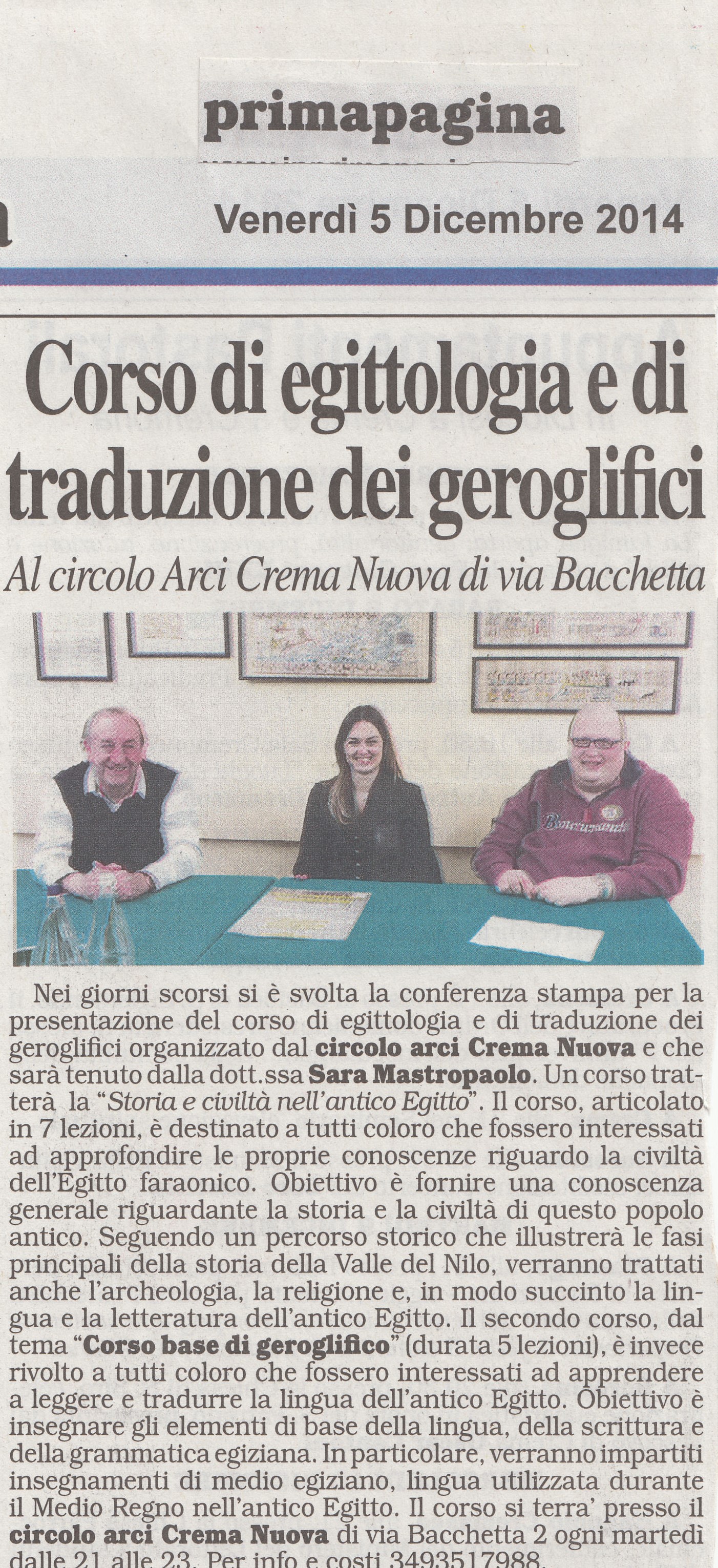 CORSO DI EGITTOLOGIA E TRADUZIONE DEI GEROGLIFICI TENUTO DALLA DOTT.SSA SARA MASTROPAOLO ALL’ARCI CREMA NUOVA 20/01-07/04/2015