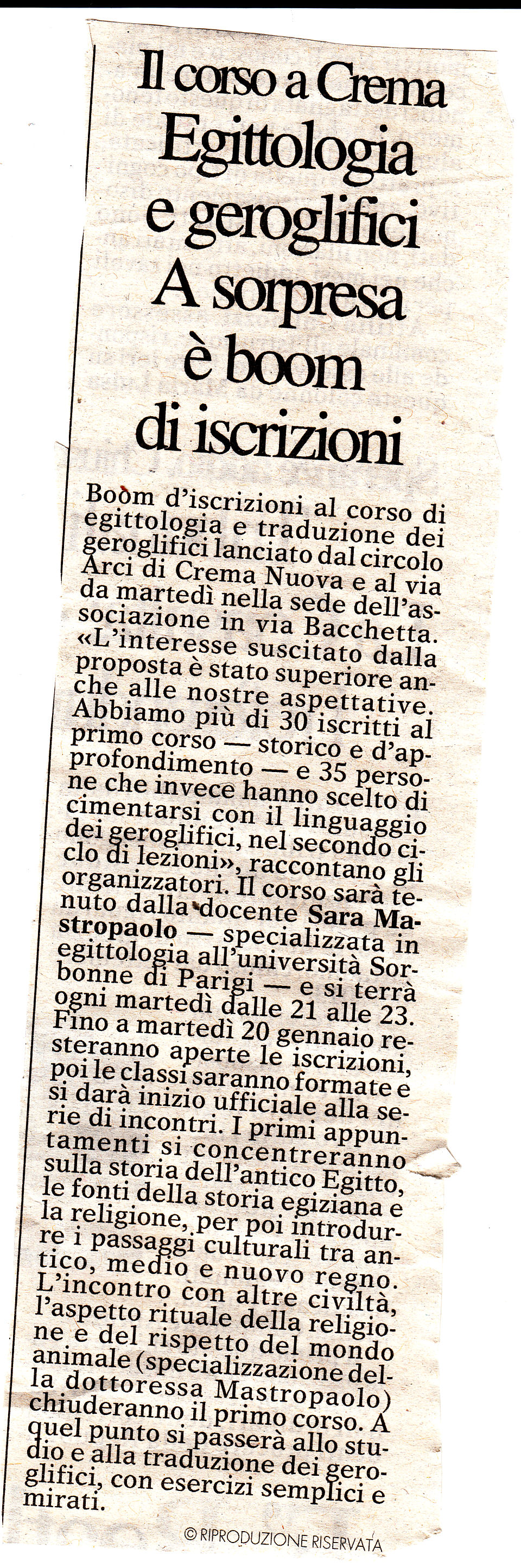 CONFERENZE SUI GEROGLIFICI EGIZI ALL’ARCI CREMA NUOVA 21-29/05/10